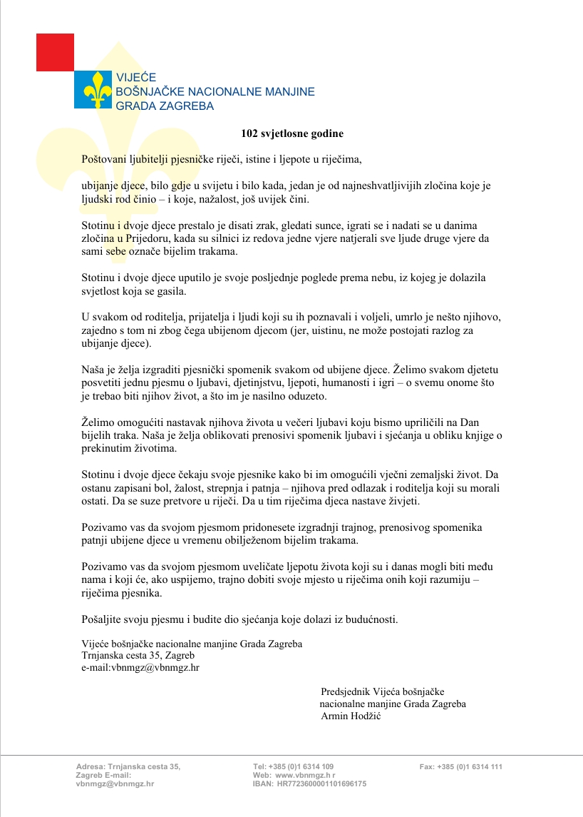 Pozivamo pjesnike i ljubitelje pisane riječi da jednom pjesmom daruju sjećanje, ljubav i dostojanstvo onima kojima je djetinjstvo nasilno prekinuto.